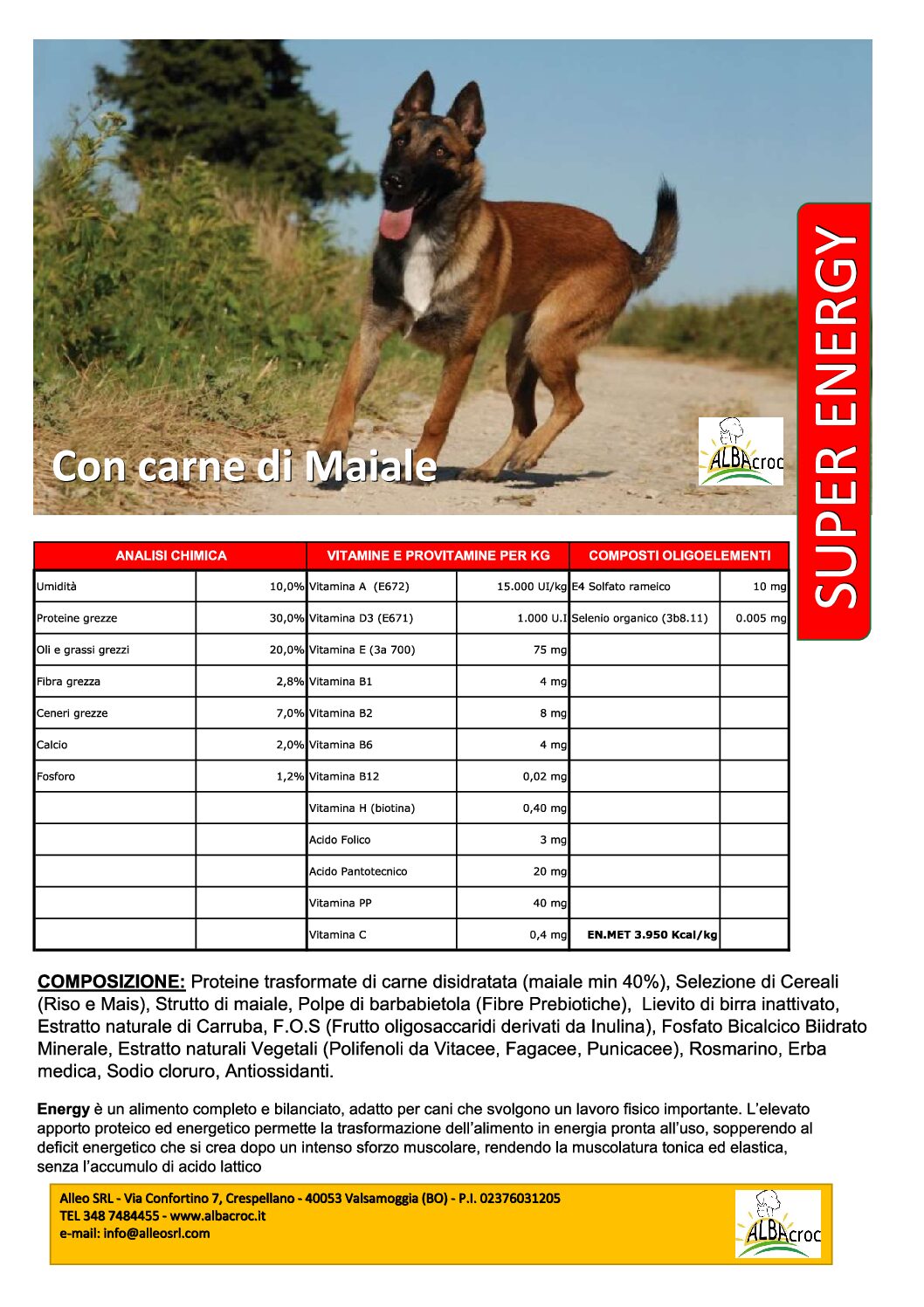 Le crocchette Albacroc Energy sonoย un alimento completo e bilanciato, adatto per cani che svolgono un lavoro fisico importante. Lโ€™elevato apporto proteico ed energetico permette la trasformazione dellโ€™alimento in energia pronta allโ€™uso, sopperendo al deficit energetico che si crea dopo un intenso sforzo muscolare, rendendo la muscolatura tonica ed elastica, senza lโ€™accumulo di acido lattico